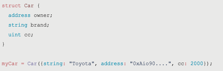myCar = Car({string: "Toyota", address: "0xAio90....", cc: 2000});