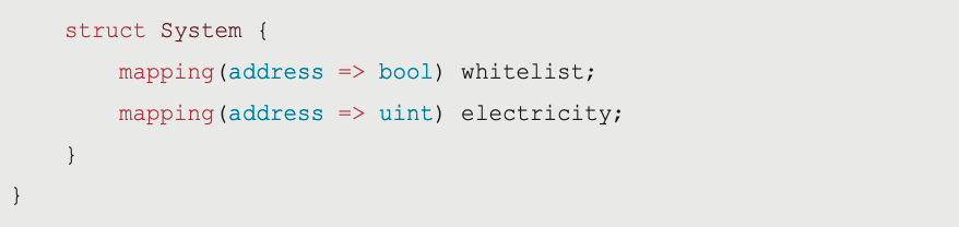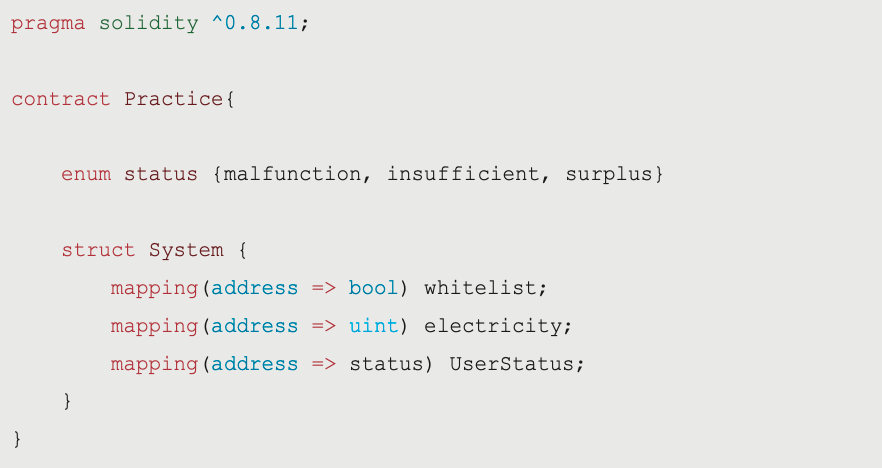 - 在我們 Practice 5 的 struct 中再宣告一個 mapping 由 address 映射 uint,用於儲存每位會員的電力系統狀態。