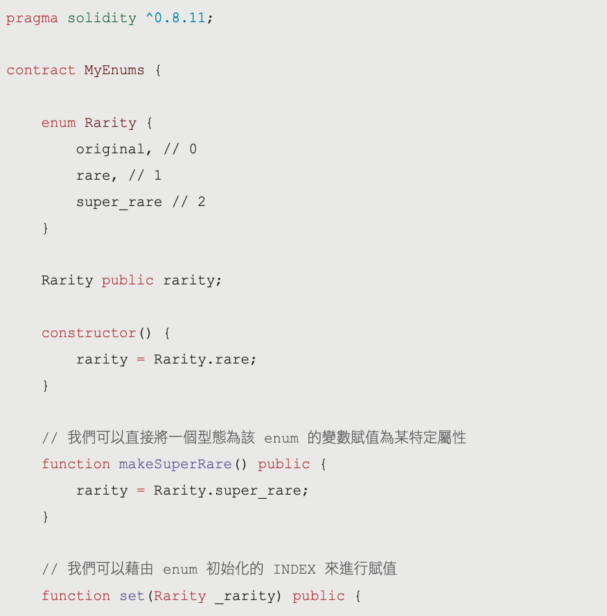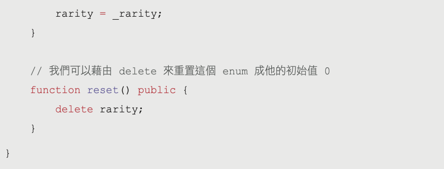 // 我們可以藉由 delete 來重置這個 enum 成他的初始值 0function reset() public {delete rarity;