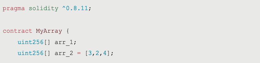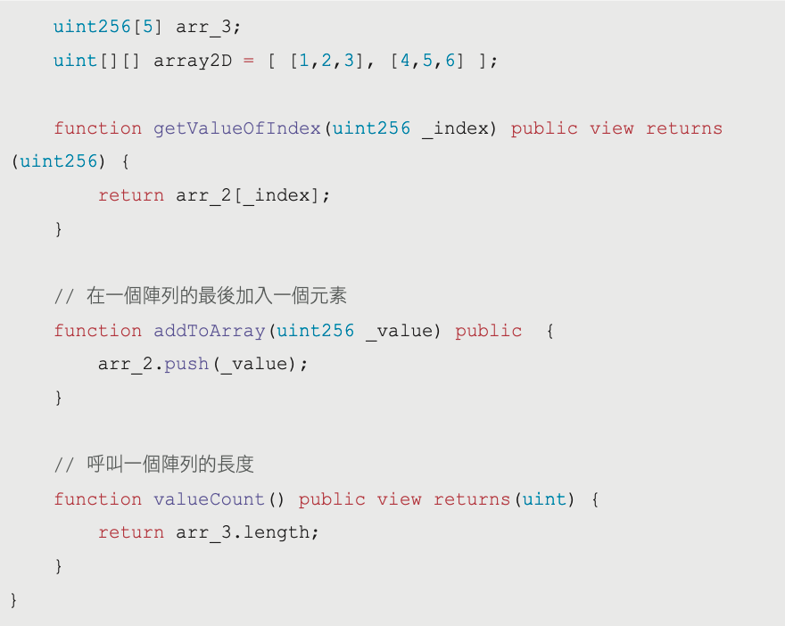 pragma solidity ^0.8.11; contract MyArray {uint256[] arr_1;uint256[] arr_2 = [3,2,4];uint256[5] arr_3;uint[][] array2D = [ [1,2,3], [4,5,6] ];function getValueOfIndex(uint256 _index) public view returns (uint256) {return arr_2[_index];}// 在一個陣列的最後加入一個元素function addToArray(uint256 _value) public {arr_2.push(_value);}// 調用一個陣列的長度function valueCount() public view returns(uint) {return arr_3.length;}}