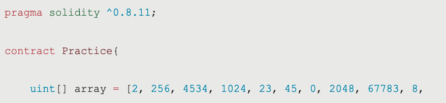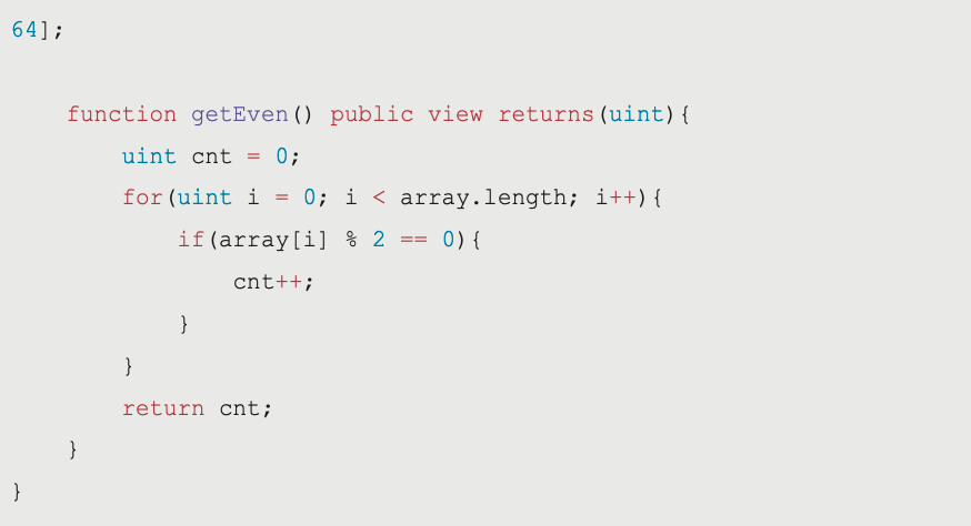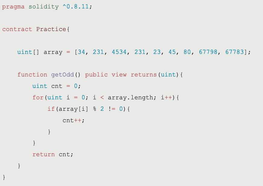 pragma solidity ^0.8.11; contract Practice{uint[] array = [34, 231, 4534, 231, 23, 45, 80, 67798, 67783];function getOdd() public view returns(uint){ uint cnt = 0;for(uint i = 0; i < array.length; i++){ if(array[i] % 2 != 0){cnt++; }}return cnt; }}