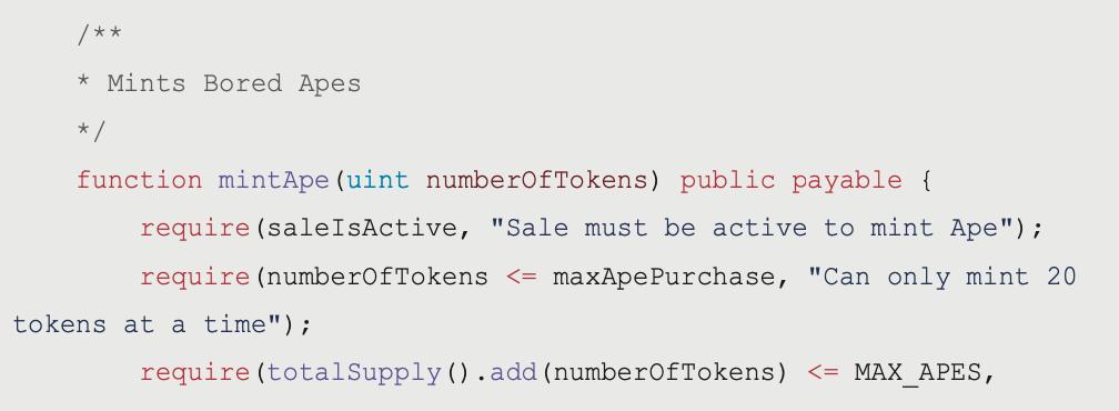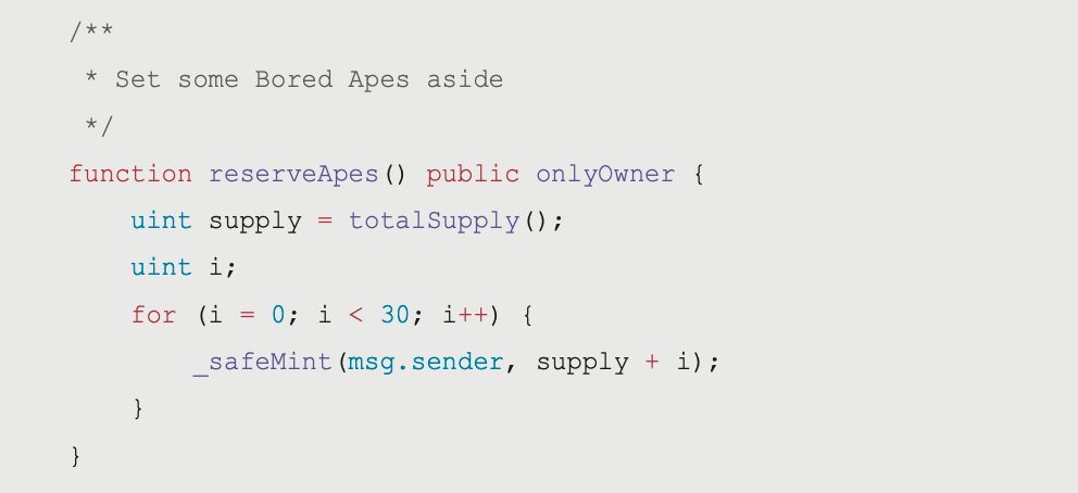 不過這裡潛藏一個問題就是並沒有像是一般的鑄造函式一樣使用 require() 來規避超過 MAX_APES 的風險,也就是說如果現在無聊猿的創作者開始創作新的猴子,就可以在按下這個按鈕之後以只付 Gas 的成本再鑄造三十隻。