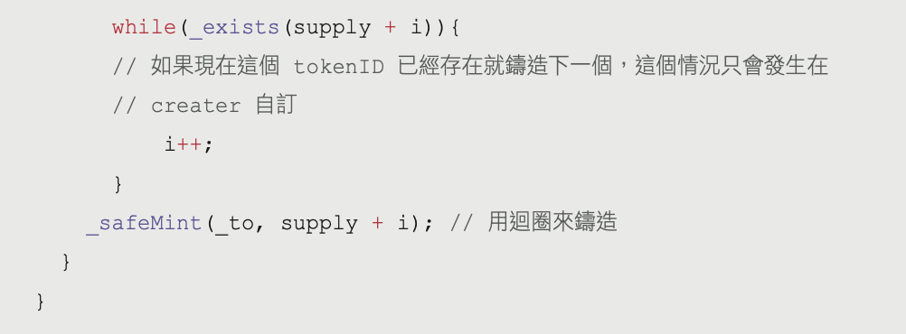 for (uint256 i = 0; i < _mintAmount; i++) { // tokenID 從 0 開始while(_exist(supply + i)){