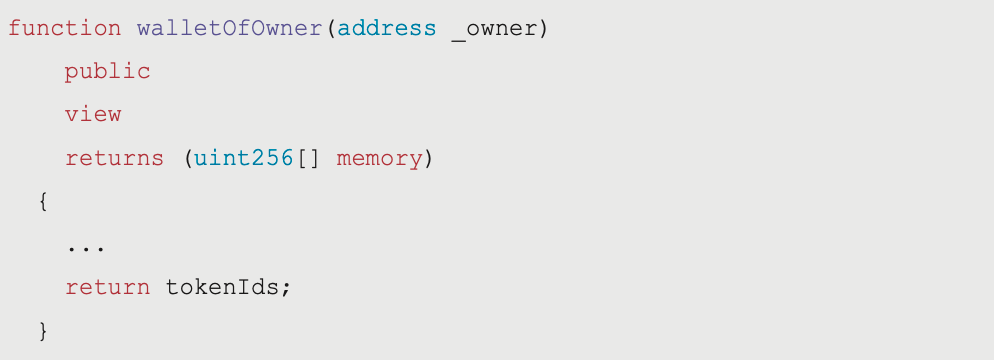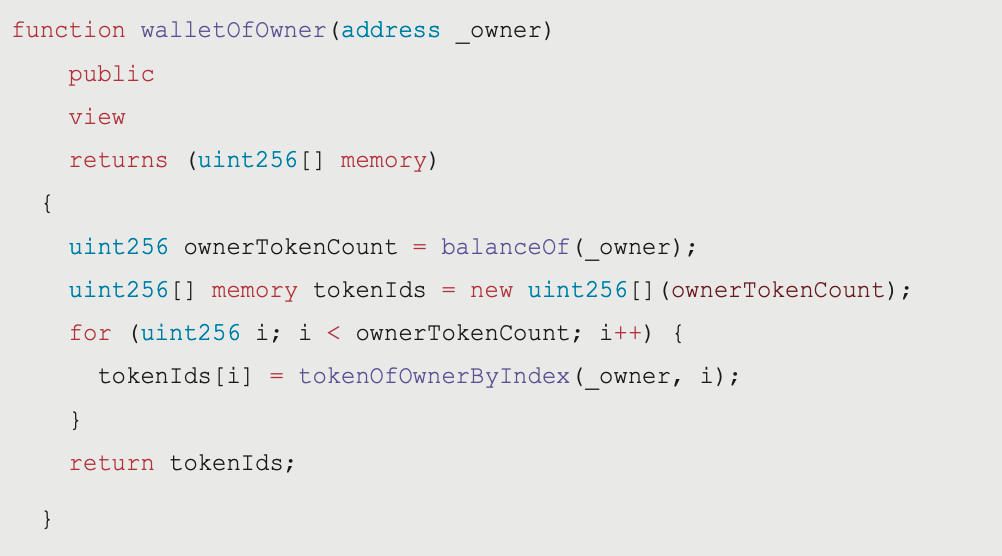 function walletOfOwner(address _owner) publicviewreturns (uint256[] memory) {uint256 ownerTokenCount = balanceOf(_owner); uint256[] memory tokenIds = new uint256[](ownerTokenCount); for (uint256 i; i < ownerTokenCount; i++) {tokenIds[i] = tokenOfOwnerByIndex(_owner, i); }return tokenIds; }