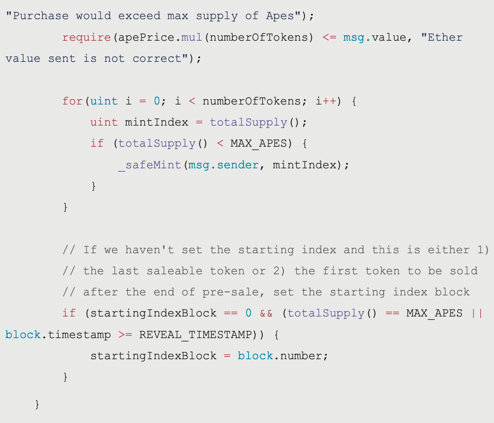if (startingIndexBlock 0 && (totalSupply() MAX_APES || block.timestamp >= REVEAL_TIMESTAMP)) {