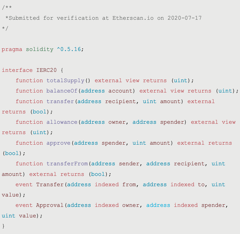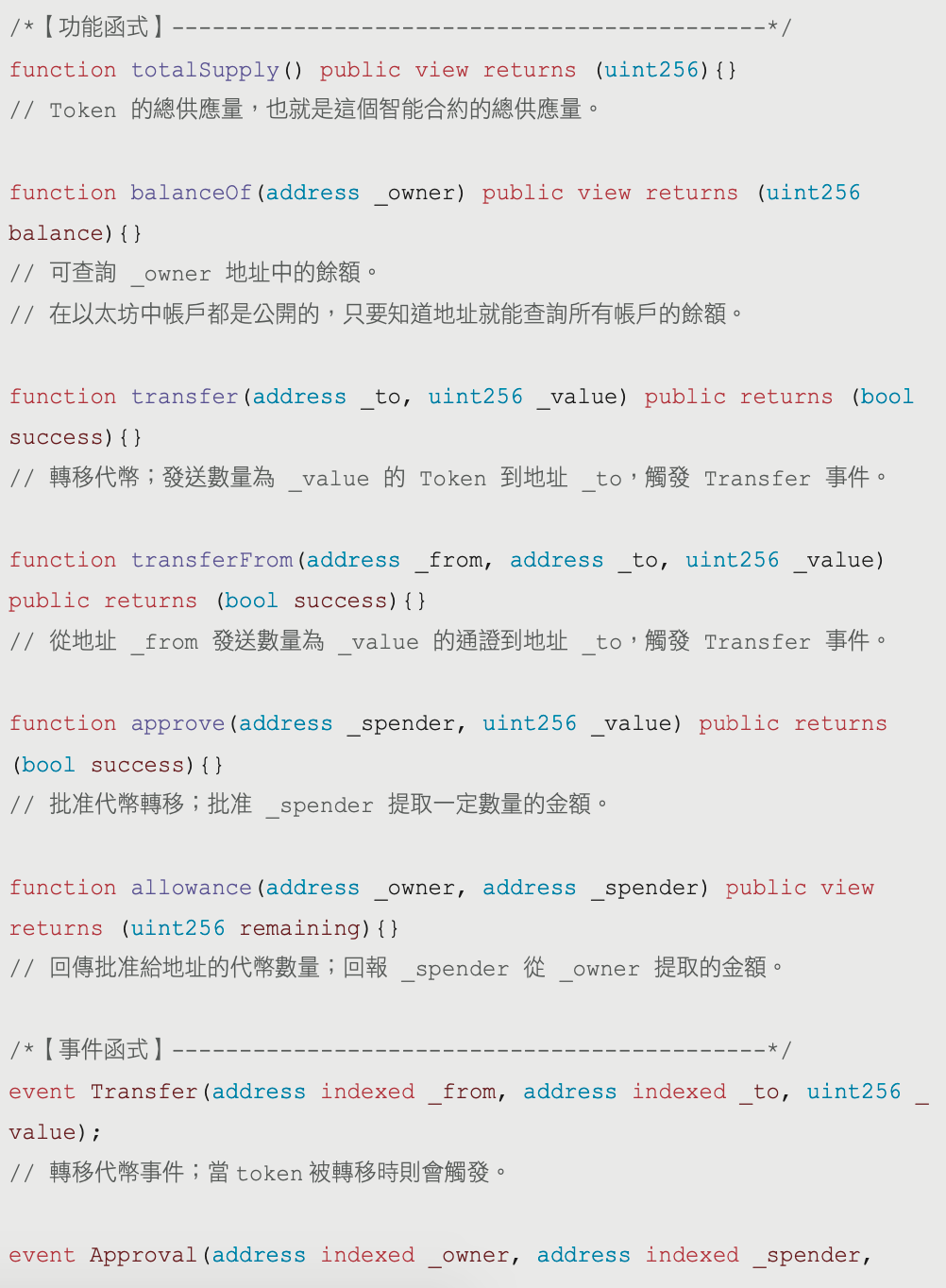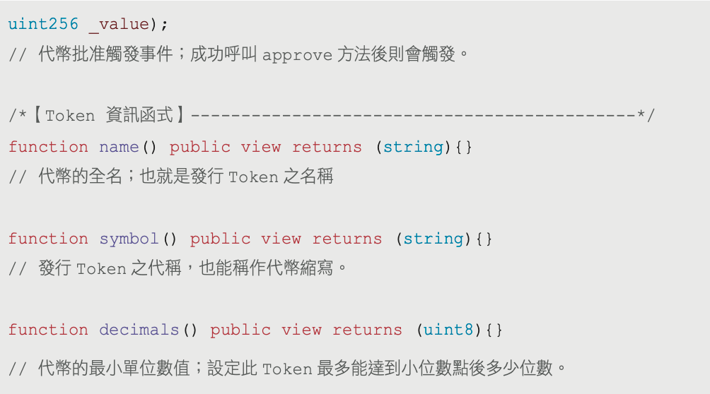 ERC-20 包含六個功能函式、兩個事件以及三個 Token 資訊的函式。