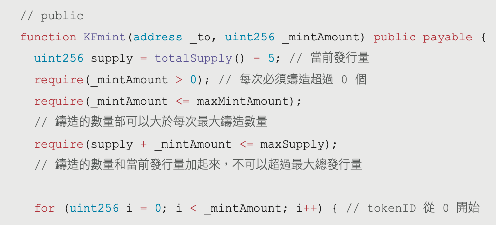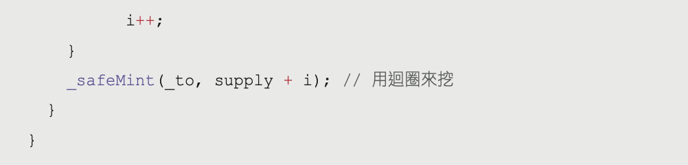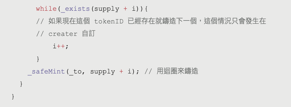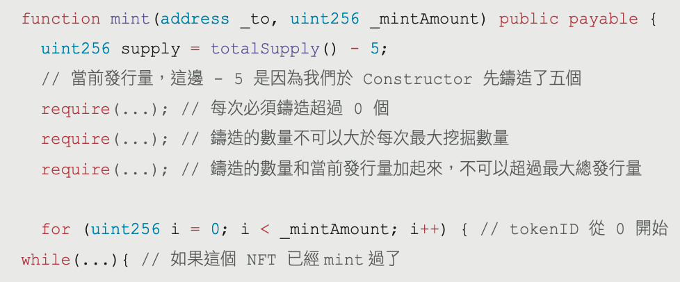 for (uint256 i = 0; i < _mintAmount; i++) { // tokenID 從 0 開始while(...){ // 如果這個 NFT 已經鑄造過了