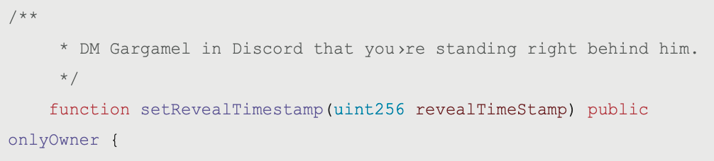 function setRevealTimestamp(uint256 revealTimeStamp) public onlyOwner {