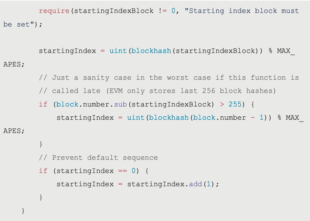 if (block.number.sub(startingIndexBlock) > 255) { startingIndex = uint(blockhash(block.number - 1)) % MAX_APES;