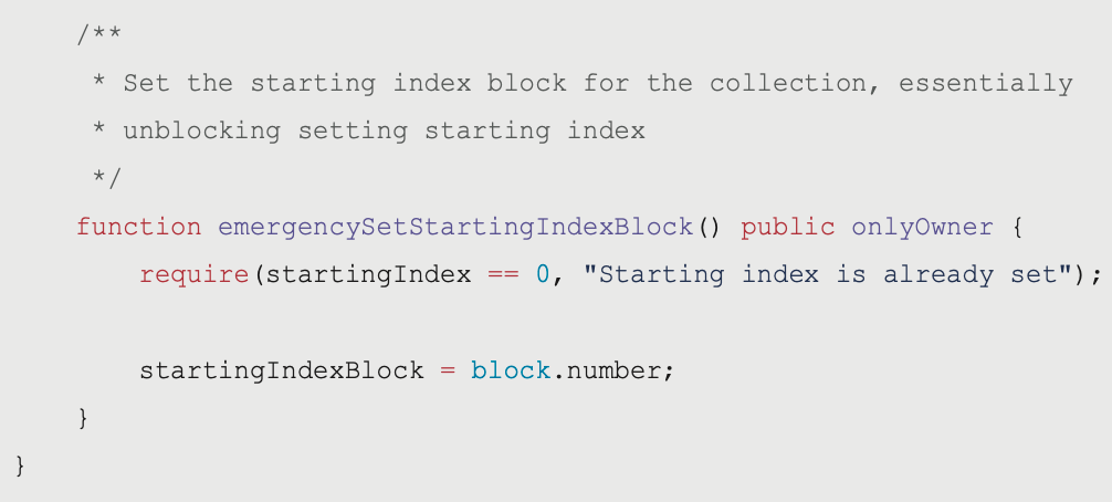 如果有人在錯誤的時間點導致 startingIndexBlock 也錯了,那還可以使用這個函式將錯誤的值調回正常的 block.number。