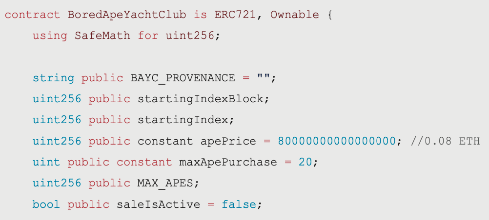 進到合約之後一開始便是定義相關的常數。包含鑄造一個無聊猿的價格,單次鑄造最大的數量,總供給數,當前是否可銷售,開盒時間點。