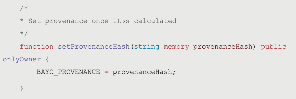 function setProvenanceHash(string memory provenanceHash) public onlyOwner {