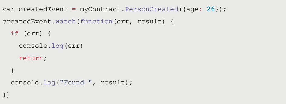 var abi = /* abi as generated using compiler */; // 要使用合約內容必須要得到合約在 compiler 之後輸出的 abi var ClientReceipt = web3.eth.contract(abi); var clientReceiptContract = ClientReceipt.at("0x1234...ab67" /* address */); // 呼叫事件 Deposit: var event = clientReceiptContract.Deposit(function(error, result) {if (!error)console.log(result); });
