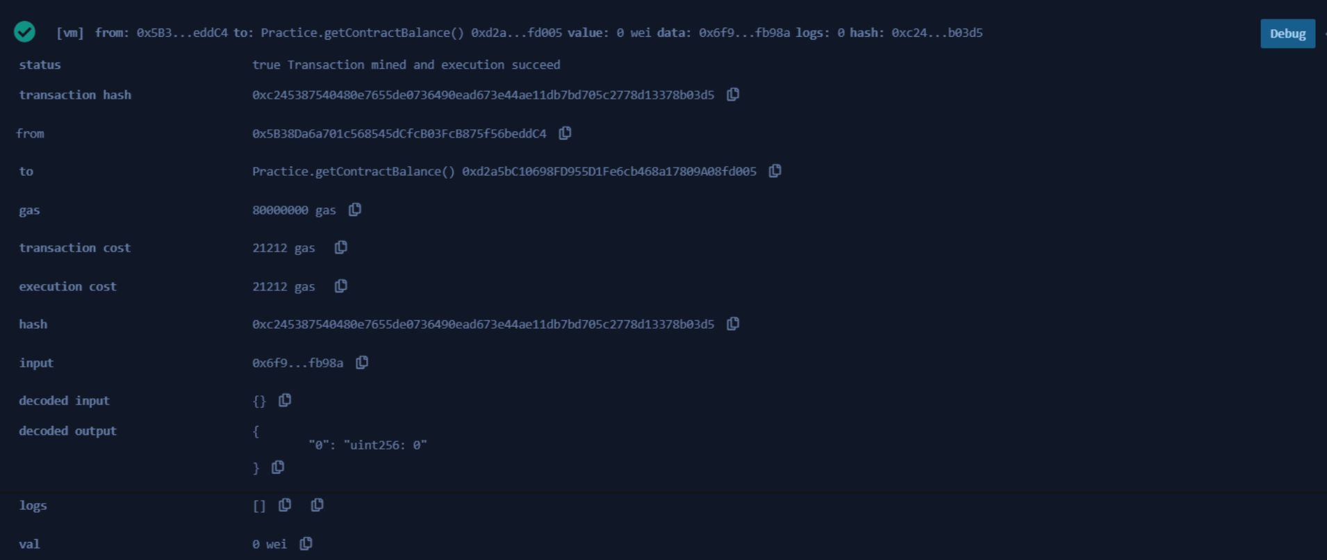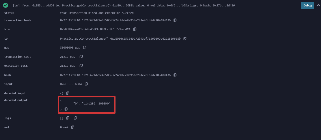 如果我們是用方法一來寫第 2 題的話,我們也可以在呼叫 getContract- Balance() 交易結果中察看是否正確,如果不是的話就可以用 Remix 提供的互動介面來查看回傳結果。