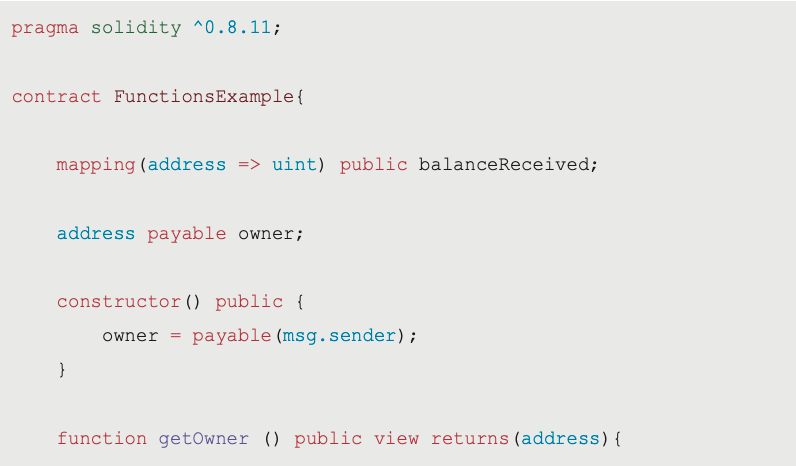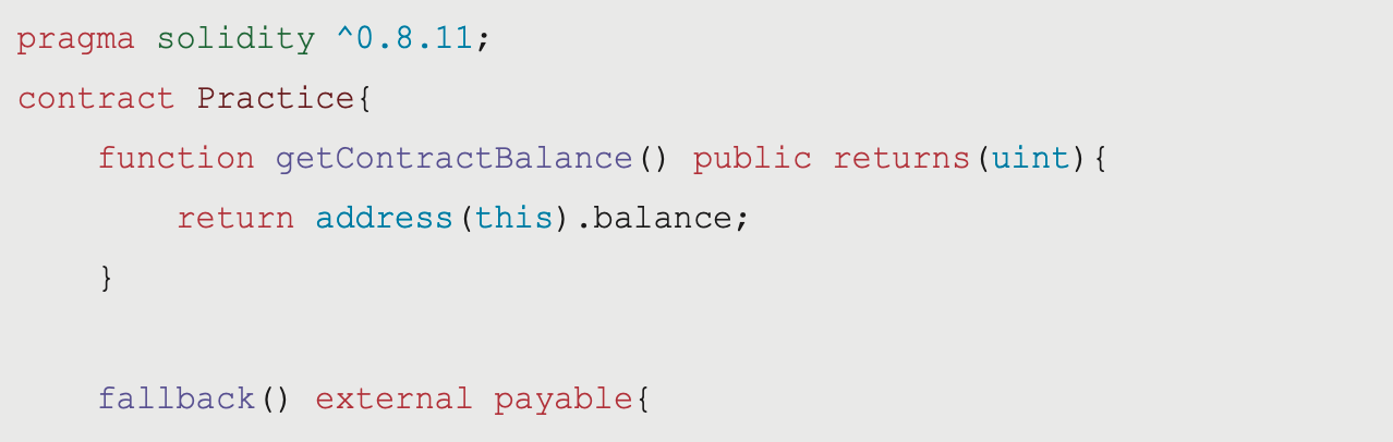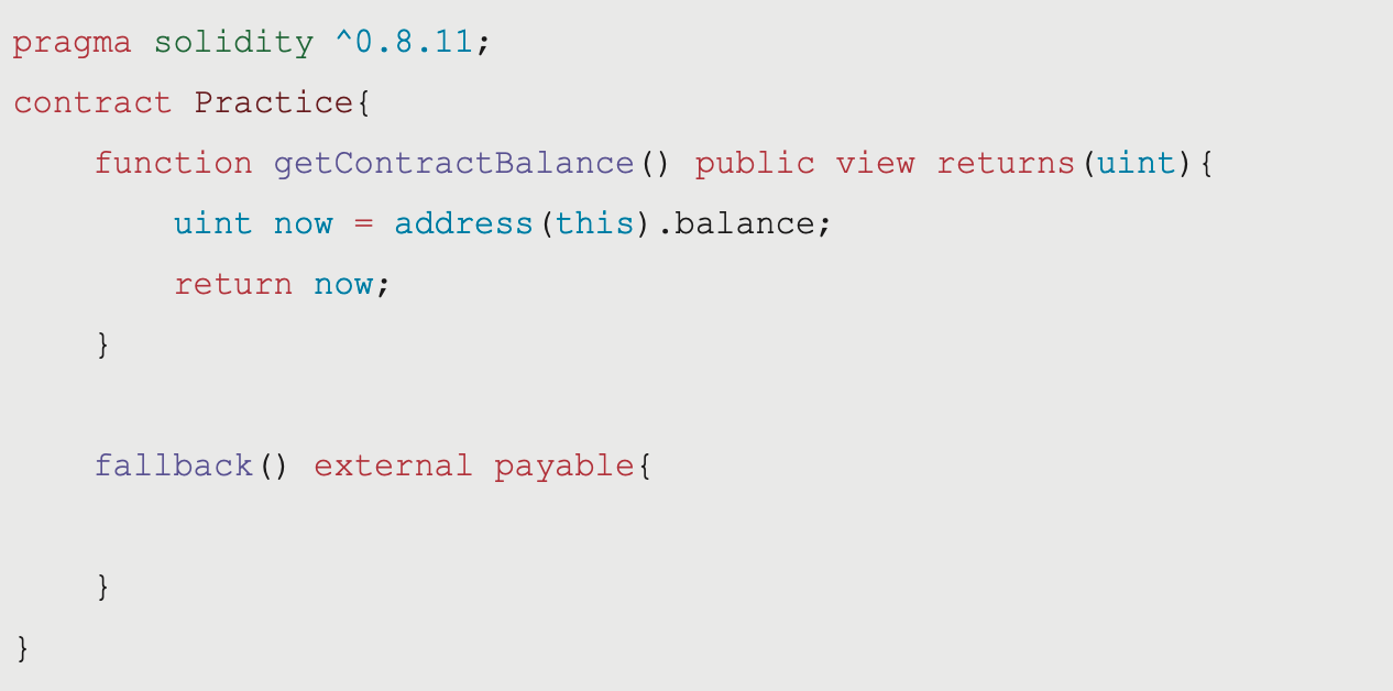 pragma solidity ^0.8.11; contract Practice{function getContractBalance() public view returns(uint){ uint now = address(this).balance; return now;}fallback() external payable{} }