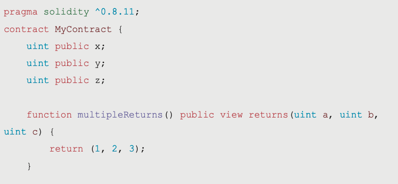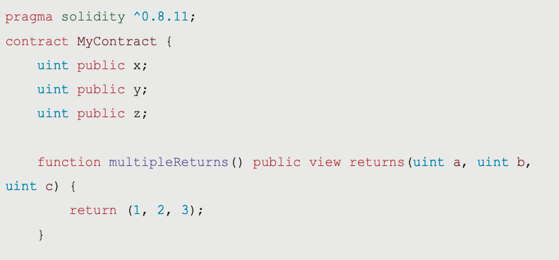 function multipleReturns() public view returns(uint a, uint b, uint c) {