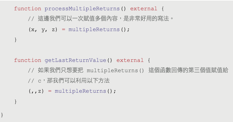 Solidity 和其他強型別語言不同的是,他可以回傳多個值,也就是 Multiple Return Values 的使用: