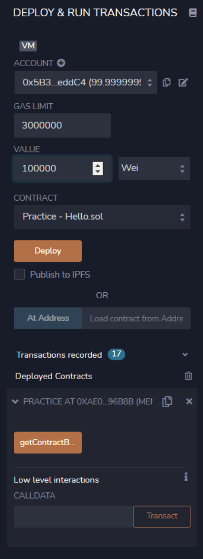 並搭配最下方 Low-Level Interactions 的 transaction 來實現匯款給合約,並以 Fallback Function 接收的目的。