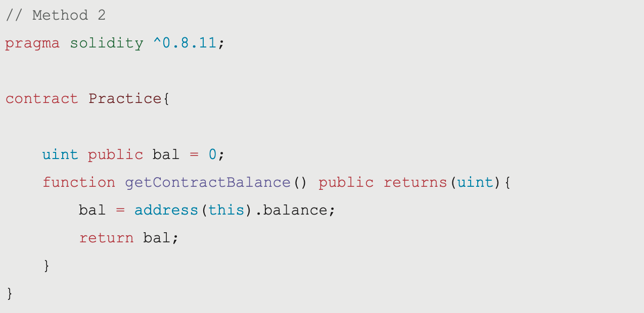 // Method 2pragma solidity ^0.8.11; contract Practice{uint public bal = 0; function getContractBalance() public returns(uint){bal = address(this).balance;return bal; }}