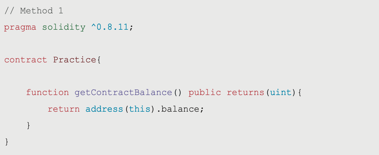 // Method 1pragma solidity ^0.8.11; contract Practice{function getContractBalance() public returns(uint){ return address(this).balance;} }