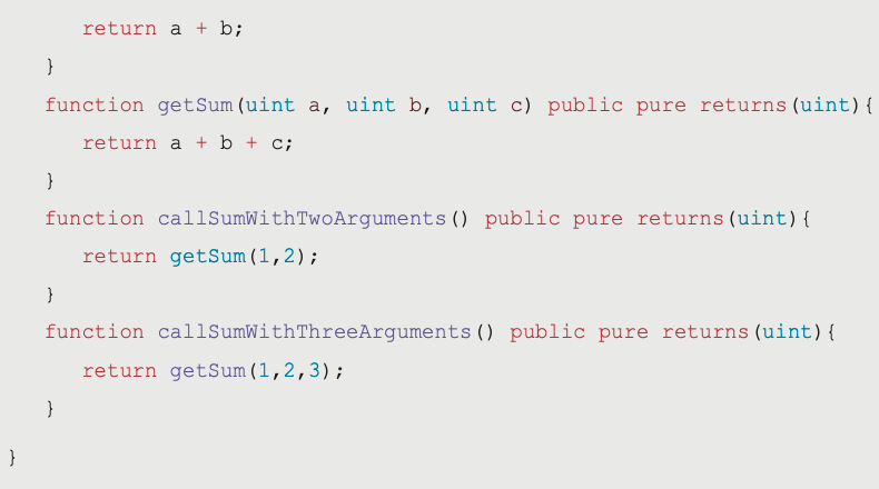 在同一樣一個作用域中我們可對同樣(名稱、可視性、回傳值相同)的函數 進行 Function Overloading,此時根據我們輸入的參數數量,或者是輸入的參數型態不同,Solidity 會自動去尋找符合的函數執行。