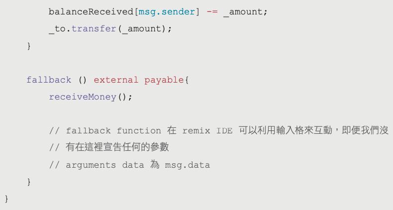 // fallback function 在 REMIX IDE 可以利用輸入格來互動, 即便我們沒有在這裡宣告任何參數