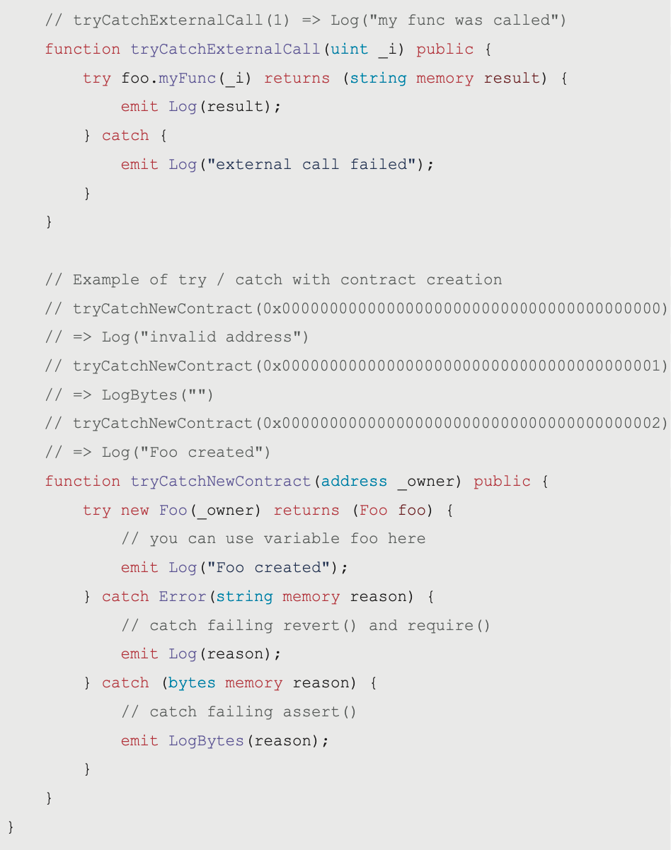 try/catch 用於確認外部執行函數和合約建立時(在一個合約裡面建立另外一個合約時)的錯誤,可以利用類條件式選擇來排除錯誤情況。