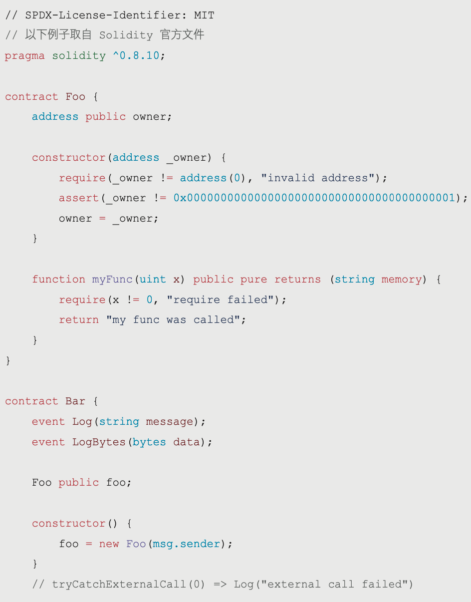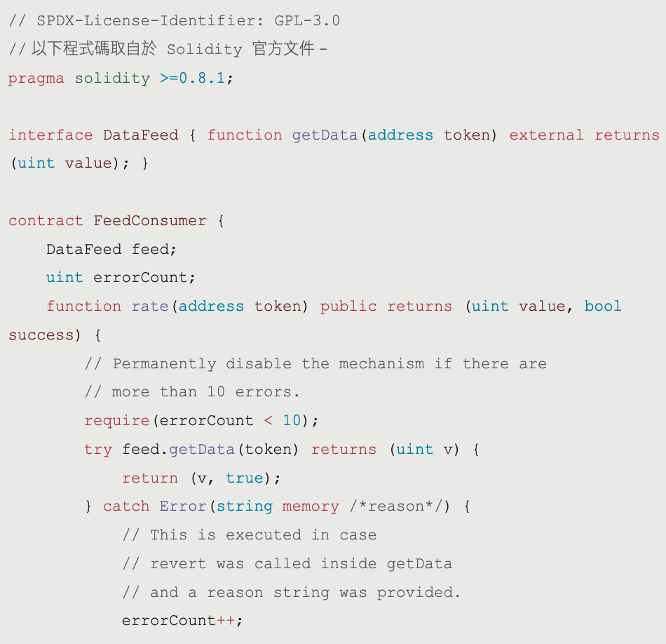 // SPDX-License-Identifier: GPL-3.0 // 以下程式碼取自 Solidity 官方文件 pragma solidity >=0.8.1; interface DataFeed { function getData(address token) external returns (uint value); } contract FeedConsumer { DataFeed feed; uint errorCount; function rate(address token) public returns (uint value, bool success) { // Permanently disable the mechanism if there are // more than 10 errors. require(errorCount < 10); try feed.getData(token) returns (uint v) { return (v, true); } catch Error(string memory /*reason*/) { // This is executed in case // revert was called inside getData // and a reason string was provided.errorCount++; return (0, false); } catch Panic(uint /*errorCode*/) { // This is executed in case of a panic, // i.e. a serious error like division by zero // or overflow. The error code can be used // to determine the kind of error. errorCount++;return (0, false); } catch (bytes memory /*lowLevelData*/) { // This is executed in case revert() was used. errorCount++; return (0, false); } } }