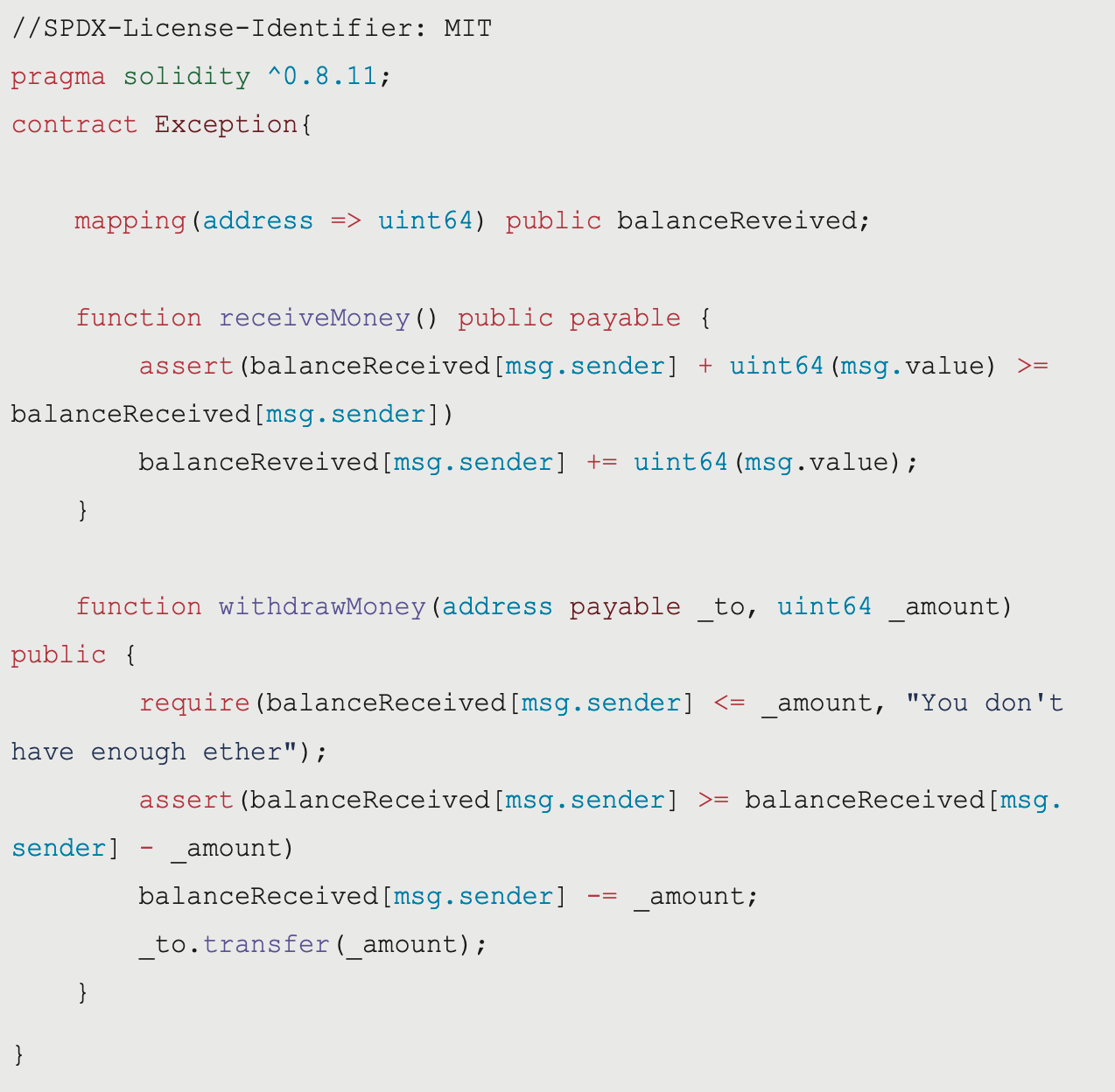 使用異常處理的最主要目的是使當前的執行被停止或撤銷,並且把原先改變的狀態回復到原本狀態,包含帳戶在原先行為後的餘額。在異常發生時,Solidity 會執行一個回退的操作(0xfd)並且讓 EVM 把所有「狀態改變」回復到原先的狀態。