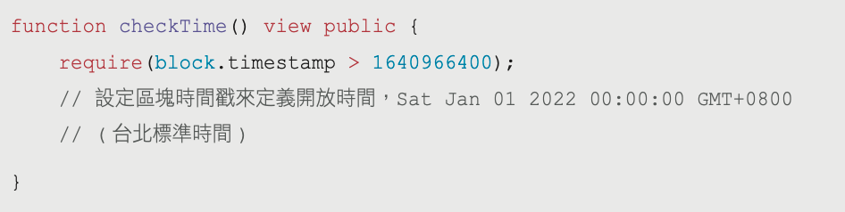 // 設定區塊時間戳來定義開放時間,Sat Jan 01 2022 00:00:00 GMT+0800 // ( 台北標準時間 )