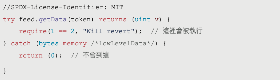 catch (bytes memory /*lowLevelData*/):當沒有其他符合的catch子句時,或是在decoding 錯誤訊息時出現問題、甚至外部呼叫時出現 assertion failing,便會執行此類catch。 -