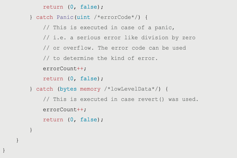 catch Panic(uint errorCode) { ... }:此類型的catch會在各種assert、除以零、異常的陣列取值、運算溢位等情況發生時被執行。 -