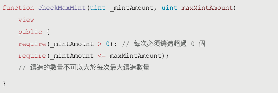 require(_mintAmount > 0); // 每次必須鑄造超過 0 個 require(_mintAmount <= maxMintAmount);