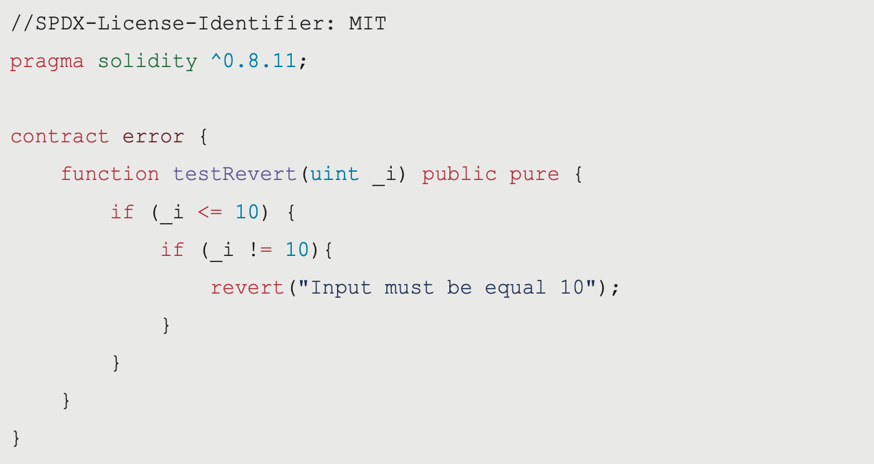 revert() 用於確認複雜狀態,意思就是說我們必須寫上一連串的巢狀 if-else 或其他條件式選擇來過濾各種情形,最後才加上 revert() 如果我們進到了錯誤結果。