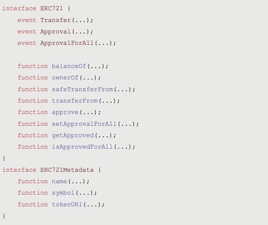 介面通常用於定義一個標準,讓之後繼承的內容都符合這套標準,例如 ERC (Ethereum Request for Comments)-721 的 interface 如下: