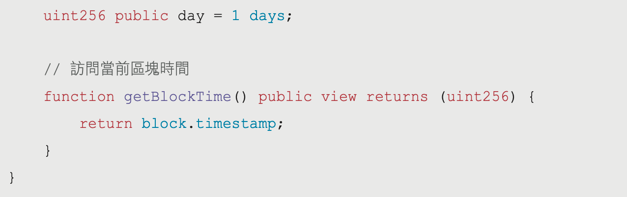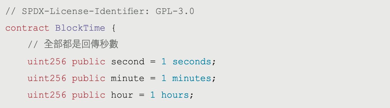 //SPDX-License-Identifier: GPL-3.0 contract BlockTime { //全部都是回傳秒數 uint256 public second = 1 seconds; uint256 public minute = 1 minutes; uint256 public hour = 1 hours; uint256 public day = 1 days; // 訪問當前區塊時間 function getBlockTime() public view returns (uint256) {return block.timestamp; } }