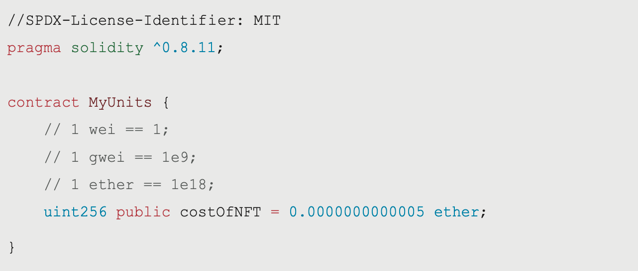 如同前一個章節在整數時的內容,我們沒辦法使用小數來表達一個值,所以在 Solidity 裡面有許多單位可供使用。