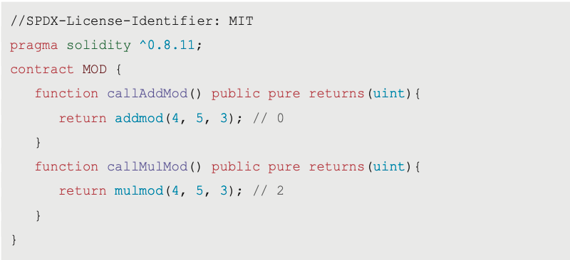 addmod(uint x, uint y, uint k) returns (uint): 以高精度 (arbitrary precision) 計算 (x + y) % k