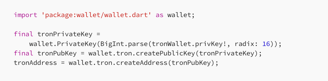 final tronPubKey = wallet.tron.createPublicKey(tronPrivateKey);