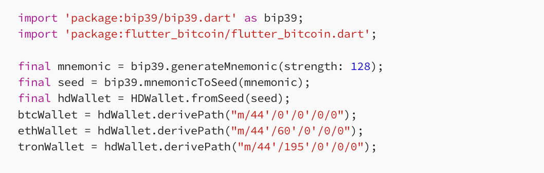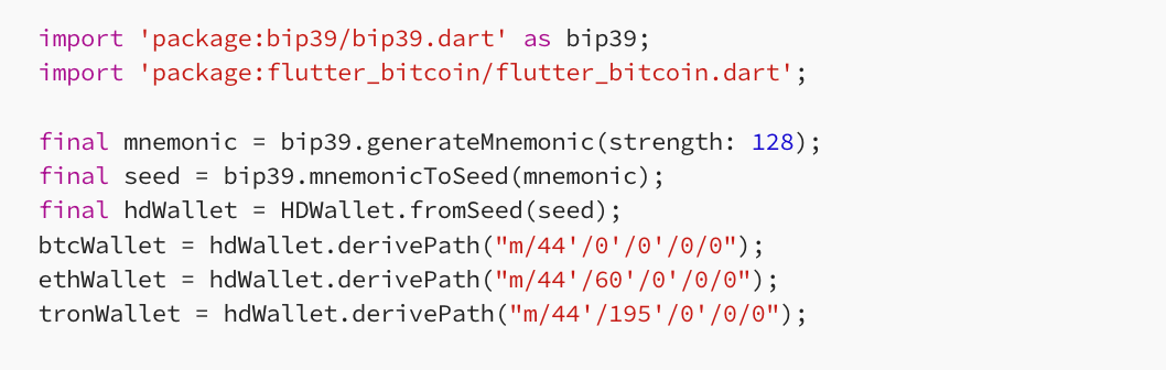 可以安裝 bip39 跟 flutter_bitcoin 套件來透過註記詞產生 HD Wallet,並按照 BIP-44 標準查到 Bitcoin, Ethereum, Tron 各自對應的 Coin Type 為 0, 60, 195,因此就可以 Derive 出對應的公私鑰:
