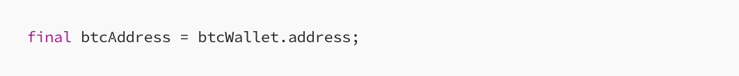 這時 btcWallet, ethWallet, tronWallet 都是 HDWallet 這個 class 的物件,裡面儲存這個錢包的公鑰跟私鑰,但要計算出錢包地址的話還需要做一些轉換,因為公鑰跟私鑰都只是長度 256 bits 的 hex 字串。前面 HD Wallet 使用的套件是 flutter_bitcoin ,預設他就有個 address 欄位可以拿到 Bitcoin 的地址: