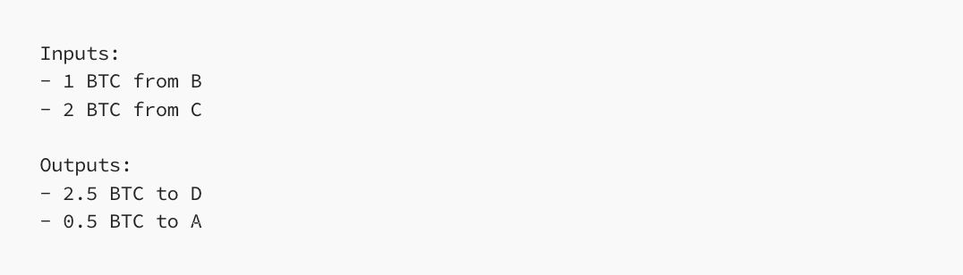 假設接下來 A 要送出 2.5 BTC 給 D,那麼這個交易的結構會長得像這樣: