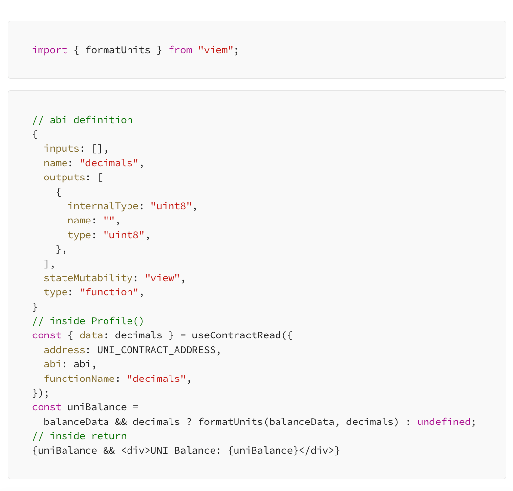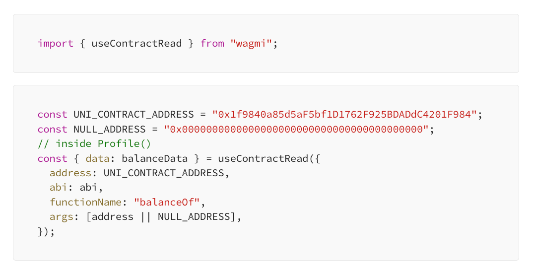 要取得當下地址的 UNI Token Balance,我們需要用到 wagmi 的 useContractRead hook,可以用來讀取任意智能合約中 view function 的結果。所以首先需要用它來呼叫 balanceOf(account) 並帶入當下連接的錢包地址: