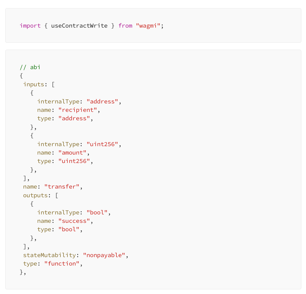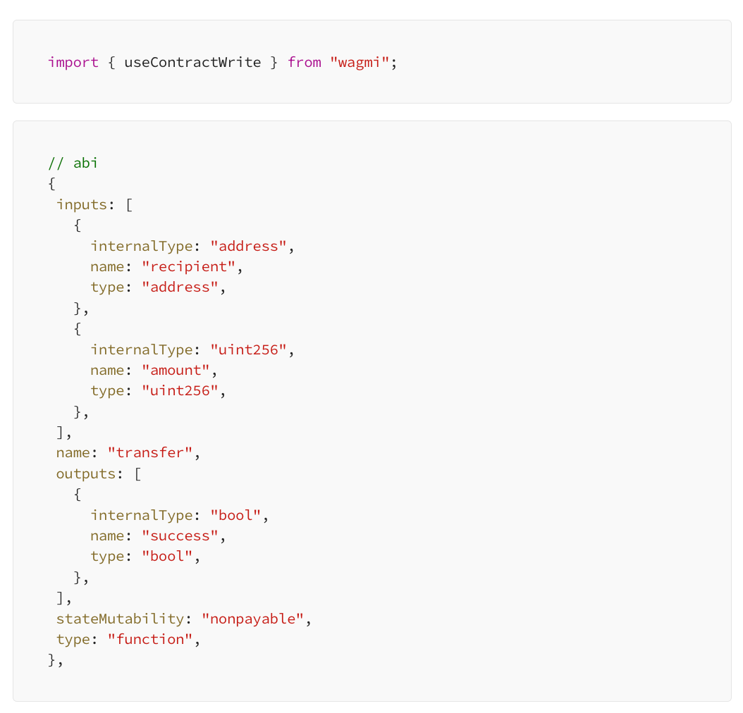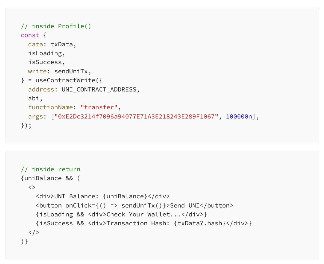 再來是送出 Transfer UNI Token 的交易,會用到 useContractWrite hook 搭配智能合約上的 transfer(to, amount) function 達成。一樣先補上需要的 import 跟 ABI:
