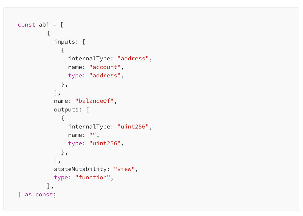 直接閱讀就能猜到大部分的意思,像是他定義清楚了 balanceOf 這個 function 的 input output 以及他是一個 view function(不會改變智能合約的狀態)。後面加上 as const 是因為這樣才能讓 Typescript 幫我們做 Type inference,從傳入 useContractRead 的 functionName , abi自動推斷出 args 跟 return value 的型別。最後就可以把拿到的 balanceData 顯示出來