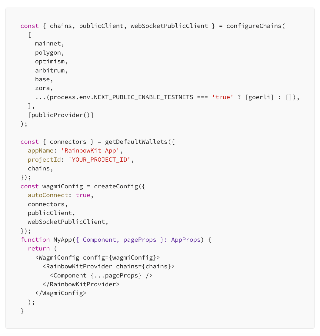 在 _app.tsx 裡可以看到詳細的用法,前面的 configureChains 之前有介紹過,再來用 getDefaultWallets 拿到預設的錢包列表(包含 Rainbow, Coinbase Wallet, Metamask 等等),用它建立 wagmi config,並把整個 App 包在 RainbowKitProvider 底下,就可以在任何地方使用 Rainbow Kit 提供的 Components。