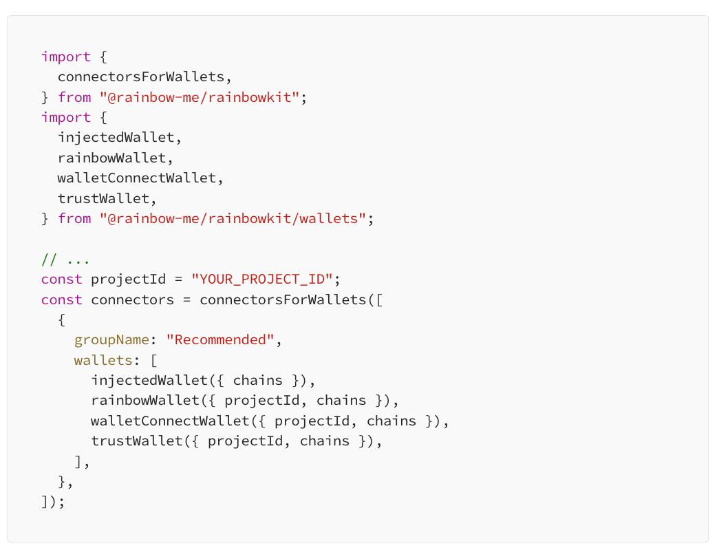 其中的 projectId 設定稍後會講到,至於 injectedWallet 指的是如果使用者有在瀏覽器安裝像 Metamask 的這種錢包 Extension,錢包就會對瀏覽器 inject 一個 window.ethereum object,因此使用 injectedWallet 就可以自動連上這種透過瀏覽器 Extension 安裝的錢包。RainbowKit 提供許多錢包選項(官方文件),有興趣的話可以任選幾個放進錢包列表中看看效果。