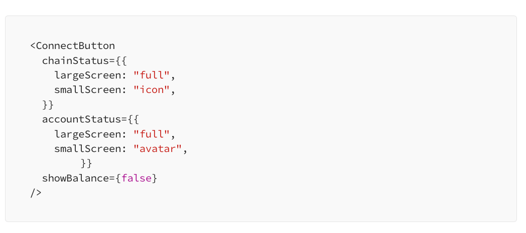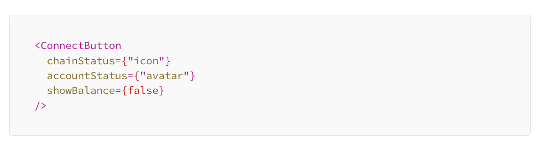 RainbowKit 也支援許多靈活的客製化,像 ConnectButton 可以指定是否要顯示 ETH 餘額、鏈的名稱、地址等等,例如以下寫法可以呈現比較簡易的錢包樣式