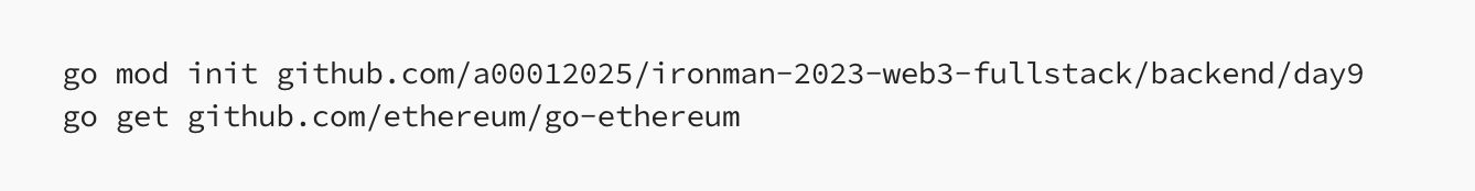 go mod init github.com/a00012025/ironman-2023-web3-fullstack/backend/day9go get github.com/ethereum/go-ethereum