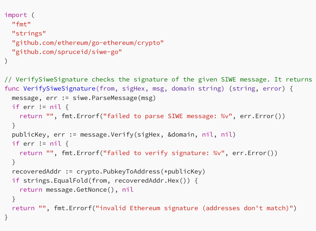 因此可以選擇性驗證訊息內的 domain 及 nonce 值是否跟後端預期的值相同。這樣就可以用來實作 VerifySiweSignature function: